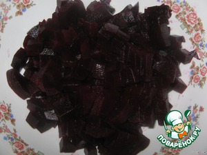 • Отваренную предварительно свеклу нарезать не мелкими кубиками.
