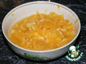 Апельсиновую мякоть нарезать кусочками (у меня порвалась в процессе!:-)) -
