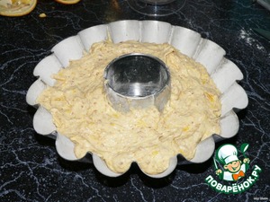 Осторожно смешать тесто с мякотью апельсинов. Так как мякоть сочная, то тесто как раз и приобретет нужную консистенцию и станет пожиже. Поместить тесто в смазанную маслом и посыпанную мукой форму с дыркой (может, хоть теперь половин раскошелится на силиконовую ;-))