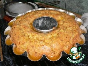 Готовый кекс вынуть из духовки, потыкать лучинкой всю поверхность и осторожно залить горячим сиропом прямо в форме. Сироп впитывается очень быстро.