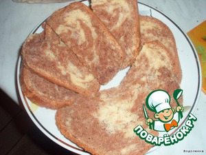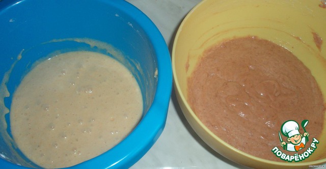 Готовое тесто разделить пополам, в одну часть добавить какао и хорошо вымешать. -