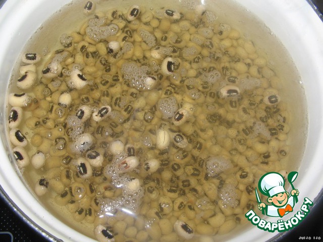 Варим фасоль. Мне нравится фасоль этого сорта ("чёрный глаз"), так как она не разваривается и варится очень быстро. У меня варилась час, а Вы по инструкции на упаковке или ориентируясь на вкус. Солить фасоль лучше в самом конце варки, так она быстрее сварится. Можно использовать и консервированную фасоль.
