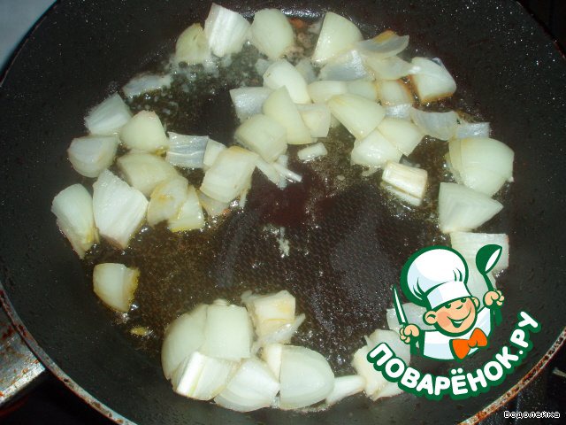 Часто покатываем лук по сковородн, чтобы все обжарилoсь до золотистого цвета, где-то 10 минут должно быть достаточно.