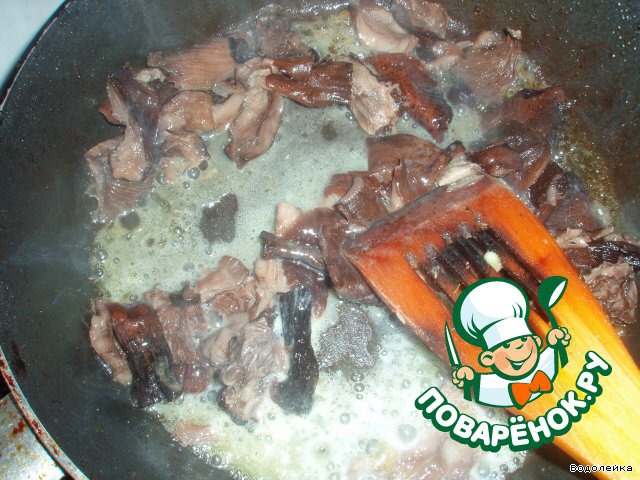 Дальше обжариваем грибы. У меня сваренные (были сушеные опята).