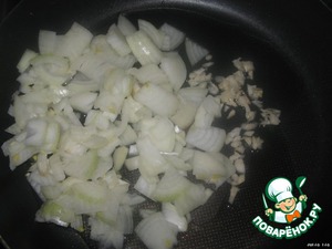 На растительном масле обжарить лук, нарезанный соломкой, и мелко нарезанный чеснок.