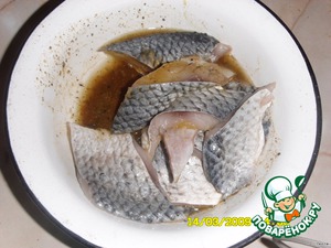 Сделать маринад из: ореховое масло, мускатный орех (щепотка), перец белый, карри, приправа для рыбы и растительное масло
