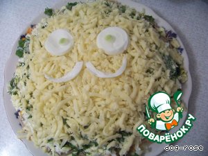 Получившийся салатик обсыпаем тертым сыром (можно и по бокам тоже, но мне захотелось, чтобы вот так было).