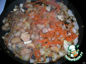 Добавляем резанную по корейски морковь, чеснок, грибы, подсаливаем, добавляем резанные кубиками помидоры, протушиваем 10 минут.