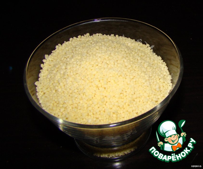 Манную крупу высыпать на большое слегка вогнутое блюдо, предварительно напиленное мукой, сбрызнуть ее холодной подсоленной водой (для этого лучше использовать пульверизатор), затем обеими руками делать вращательные движения, перекатывая крупу по кругу до образования первых крупинок кус-куса. Затем, добавляя после нескольких прокаток то воду, то муку до тех пор, пока крупинки кус-куса не увеличатся, превратившись в маленькие шарики. Просеять крупинки кус-куса сначала через сито с крупными отверстиями, затем через сито с мелкими отверстиями. Зерна, которые останутся в последнем сите, и будут использованы для приготовления кус-куса