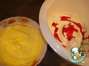 Делим сливки на 2 части. В меньшую часть добавляем желтый краситель, в бОльшую - красный, и при помощи кондитерского мешка украшаем наш цветок. -