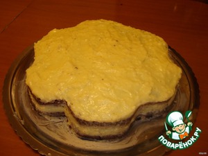 Половину заварного крема выкладываем на корж, другую половину - на верх и бока.