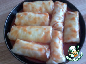 Томатный соус разводим водой (я развела 1 ложку соуса на 3/4 стакана воды), заливаем им голубцы и ставим в горячую духовку на 15-20 минут. -