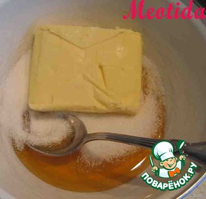 в миске смешиваем масло, мед, сахар (1/2стакана), соль и ванилинчик, ставим на водяную баню и готовим, пока масло полностью не растворится -