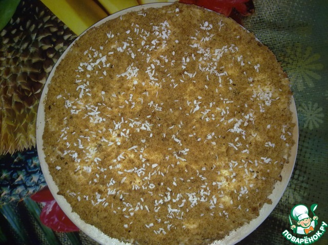 выкладываем на блюдо первый корж, смазываем половиной крема, посыпаем измельченными орешками (можно еще и любыми фруктиками) -