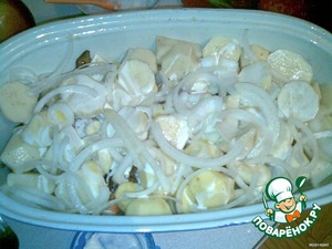 Следующий слой - картошка (режем на кусочки, солим+перчим)