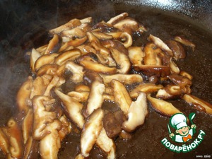 Шляпки грибов режем соломкой и обжариваем на растительном масле с добавлением соевого соуса 2-3 минуты.
