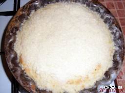 Через 20 мин. достать пирог из духовки и верх пирога засыпать штрейзелем,