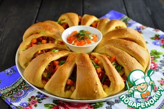 Тесто осторожно руками разложить и разровнять в смазанной маслом форме по дну и бокам, выложить на тесто начинку.