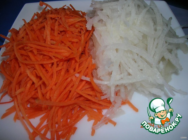 Нарезаем соломкой (по-корейски) редьку и морковь.