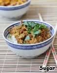 Посыпаем зеленью кинзы. И сразу подаём горячим. При отсутствии рисовой лапши, можно заменить обычной.
