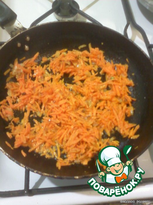 Нарезать лук кубиками, морковку натереть на тёрке и обжарить на растительном масле.