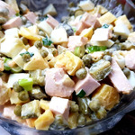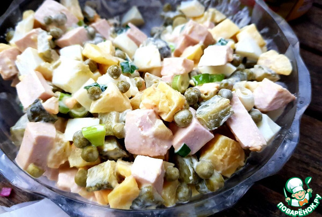 Этот салат немного напоминает «Оливье», но все же заметно отличается от него по вкусу. Очень сытный. Я была от него не в восторге, а мужу понравился. Судите сами...