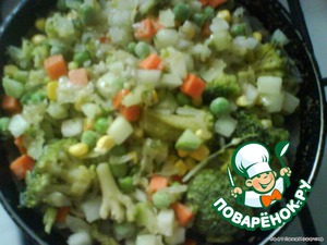к уже обжаренному луку добавляем смесь замороженных овощей и слегка обжариваем.