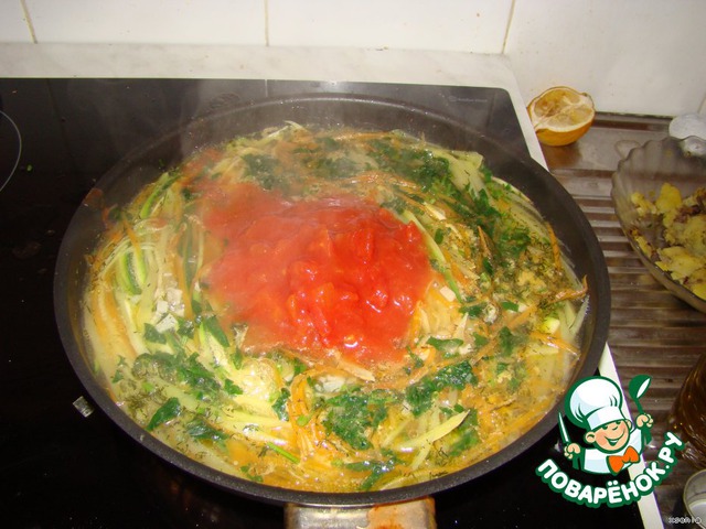 Заливаем водой так, чтобы она была на уровне овощей.. не покрывала их... Добавляем половину маленькой банки консервированных помидоров (Помидоры предварительно порубите)
