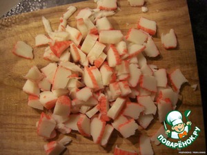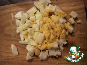 Отвариваем: кальмаров 1-2 мин., рис до готовности и яйца вкрутую. Нарезаем "зверька" мелкой соломкой