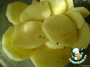 Картофель почистить, разрезать на кружки и оставить стоять в соусе из растительного масла, соли, вегеты и пропущенного через пресс чеснока.