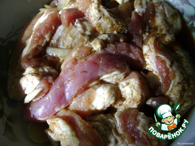 Грудинку разрезать и замариновать с пивом, луком и специями не менее, чем на 1 час.