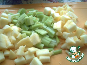 • Режем яблочко и огурчик соломкой.