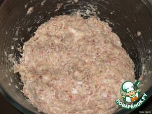 Фарш - свинина, говядина, куриннный фарш, лук, чеснок, соль.