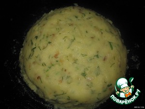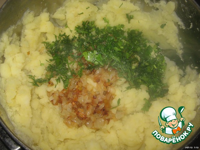 С картофеля слить жидкость (оставить совсем немного, чтобы не было сухо), размять его.