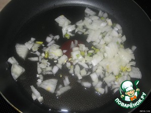 Пока варится картофель, поджарить лук (1 шт), нарезанныый кубиками, на растительном масле до золотистости.
