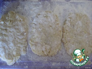 Берём обкатанный шарик и кладем на посыпанную мукой поверхность и хорошо придавливаем (чтобы котлетка была меньше 1 см), аккуратно поправляем бока и делаем овальную форму.