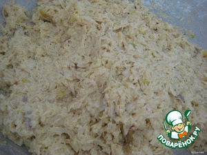 В уже отжатую капусту вбить 5 яиц, выложить сырой нарезанный лук, обжаренный лук, всыпать 2 стакана муки (меньше или больше, зависит от размера капустины), соль, перец.