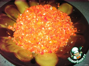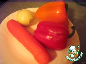 Берем лук репчатый, перчики болгарские по 1 шт. разных цветов и морковочку (у меня была большая 1 шт.)
