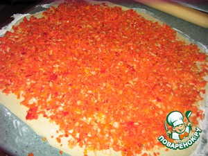 Тесто раскатать в тонкий пласт 1-2 мм, равномерно разложить подготовленные овощи по всей поверхности.