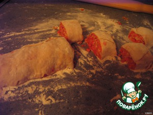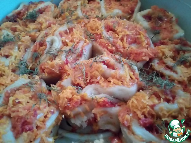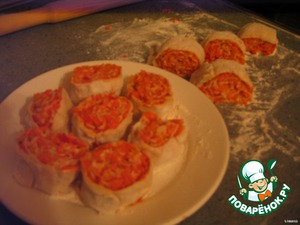 Сворачиваем в рулет, нарезаем кружками толщиной 2-3 см