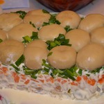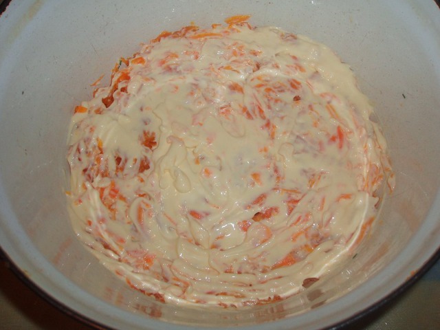 Отварную морковь натереть на крупной или мелкой терке (кому как нравится) и выложить ее на грибы, немного придавить сверху и покрыть майонезом. -