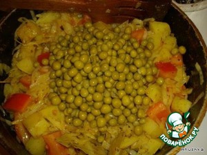 Добавляем горошек. Перемешиваем. Уменьшаем огонь до маленького и тушим под крышкой помешивая до готовности.