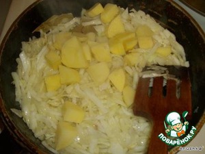 Добавляем крупно порезанный картофель. Обжариваем, постоянно помешивая.