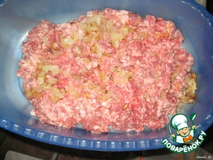 Пожарить лук и добавить в фарш половину лука, посолить, поперчить