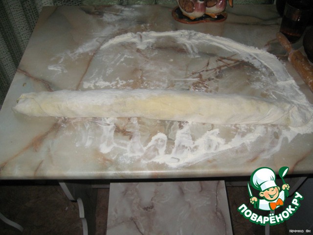 Из теста скатать тонкий пласт, чем тоньше, тем лучше.