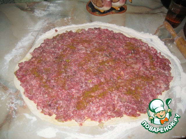 На него выложить тонким слоем фарш. Специи на ваш вкус. -
