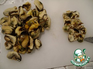 Готовим начинку: мидии отварить с солью и лаврушкой 3-5 мин., остудить, разрезать на 2-3 части