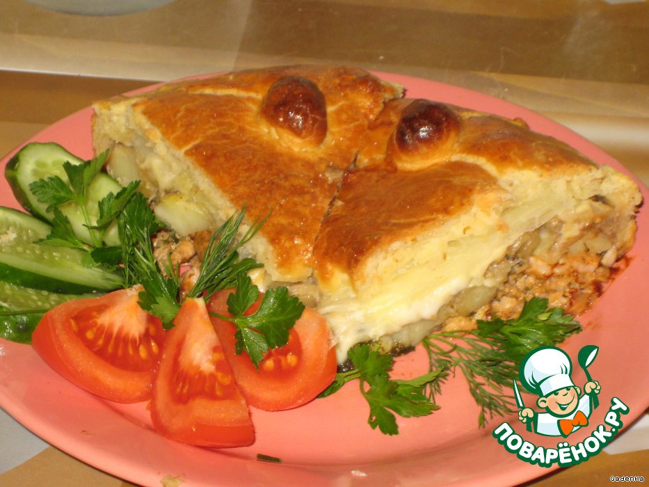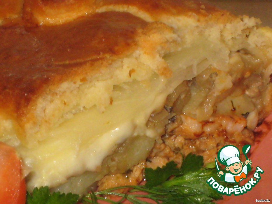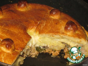 Давно не баловала своего мужчину, захотелось не только вкусно, но и красиво подать обычный ужин, после которого проси чего хочешь))) Состав блюда довольно простой, но получается вкусно, а если иметь подходящую красивую форму для запекания, то такое горячее на праздничном столе будет смотреться красиво. Запеченная свинина под картофельно-грибным одеялом, с расплавленным сыром, а для нежности и особой вкусовой нотки добавила капусты, получилось нежно и вкусно. Сверху накрыла тестом, которое заслуживает отдельного внимания, нежное, мягкое, ненавязчивое, все так гармонично, и не смотря на большой состав, ничего лишнего не оказалось.