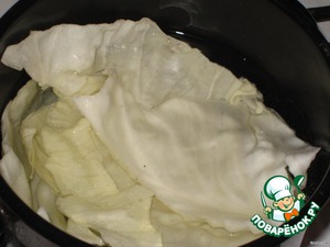 Капустные листья отварить в подсоленной воде 5-10 минут, в зависимости от капусты, чтобы были мягкие. Остудить.