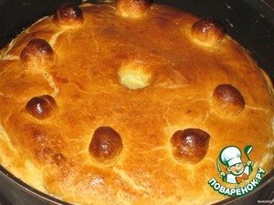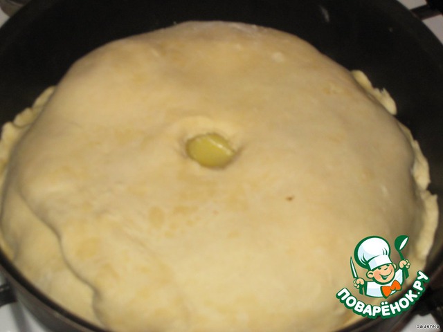 Накрываем сие произведение тесто и подтыкаем края внутрь, вдоль стенок формы. Получается сверху выглядит как пирог, только дно без теста.
